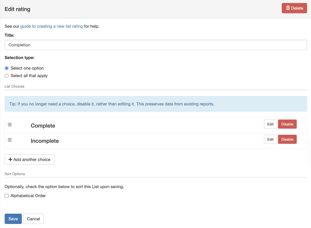 - We recommend creating two items under List Choices: “Complete” and “Incomplete.” Click “Save” to create the rating.